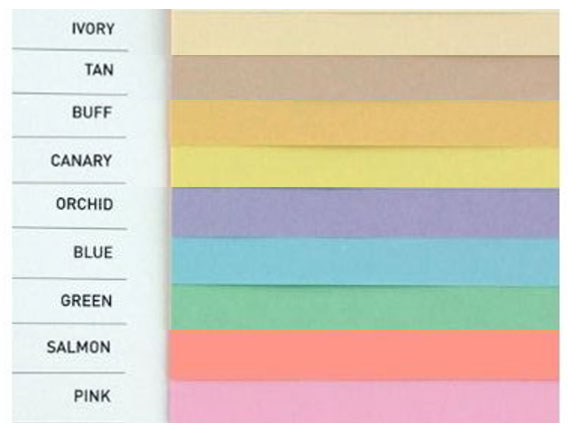 Standard 20# bond colors include blue, pink, canary, orchid, green, tan, salmon, buff, and ivory. See the bottom of this page for color samples.